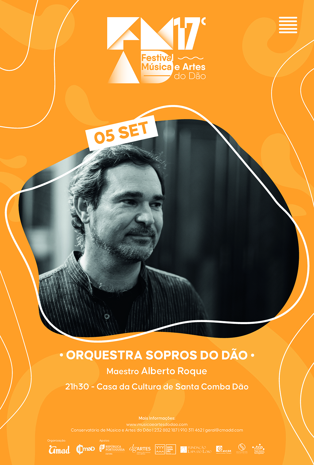 "A Orquestra de Sopros do Dão apresenta a sua 3.ª edição de estágio orquestral, sob direção do maestro Alberto Roque, dando continuidade a um projeto formativo e artístico iniciado em 2014 com o Maestro Luís Carvalho e prosseguido em 2016 sob a direção do Maestro António Saiote. Promovido pelo Conservatório de Música e Artes do Dão, no âmbito da 17.ª edição do Festival de Música e Artes do Dão, este estágio reúne jovens músicos da região e de vários conservatórios e universidades do país, num cruzamento com músicos profissionais da região e professores do CMAD, numa experiência intensiva de aperfeiçoamento técnico, artístico e humano. Sob a direção do Maestro Alberto Roque, esta edição reafirma o compromisso com a excelência e com a criação de oportunidades para músicos em início de carreira. Este projeto procura contribuir para o reforço do ecossistema cultural e educativo da região, complementando a dinâmica artística existente e valorizando o trabalho desenvolvido por instituições e artistas locais, cujo impacto é cada vez mais reconhecido a nível nacional e internacional".