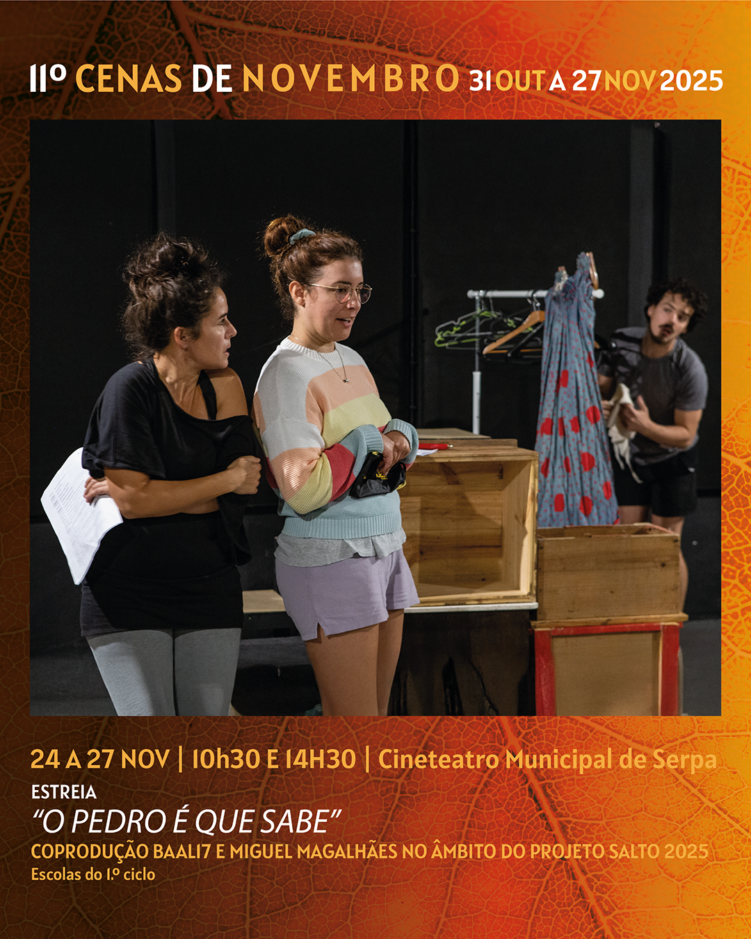 Destaque no 11.º Cenas de Novembro para a estreia de “O Pedro é que sabe”, de Miguel Magalhães, vencedor do Projeto SALTO 2025 – chamada aberta da Baal17 para jovens criadores. Dirigido a crianças entre os 6 e os 10 anos, “O Pedro é que sabe” parte da conhecida história de "Pedro e o Lobo" para questionar temas como a verdade, a mentira, os rumores e o impacto da desinformação na forma como vemos o mundo e os outros.