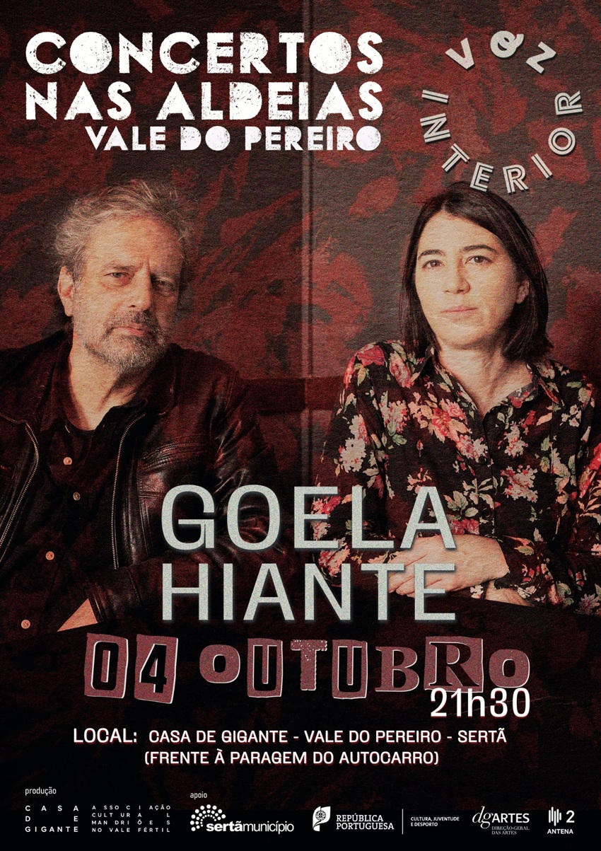 A Casa de Gigante recebe, no dia 4 de Outubro, pelas 21H30, a GOELA HIANTE, para mais um dos seus Concertos Nas Aldeias, desta vez na nossa. Tod_s ao Vale do Pereiro para o regresso de Marta Abreu à VOZ INTERIOR e para a estreia aqui de Adolfo Luxúria Canibal. Imperdível e de entrada livre (pela ordem de chegada).
