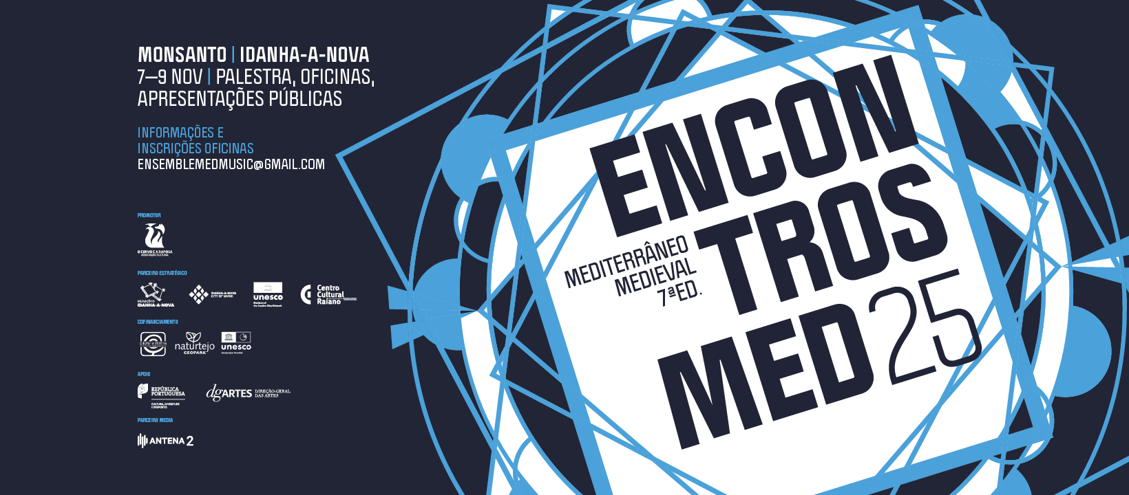 Os Encontros Med tem o apoio da República Portuguesa – Cultura, Juventude e Desporto / Direção-Geral das Artes e estão integrados no Programa Geografi a Criativa Festival da Paisagem, um projeto promovido pela NaturTejo GeoPark com coorganização do Município de Idanha-a-Nova, sendo apoiado pela União de Freguesias de Monsanto e Idanha-a-Velha e pela Antena2.