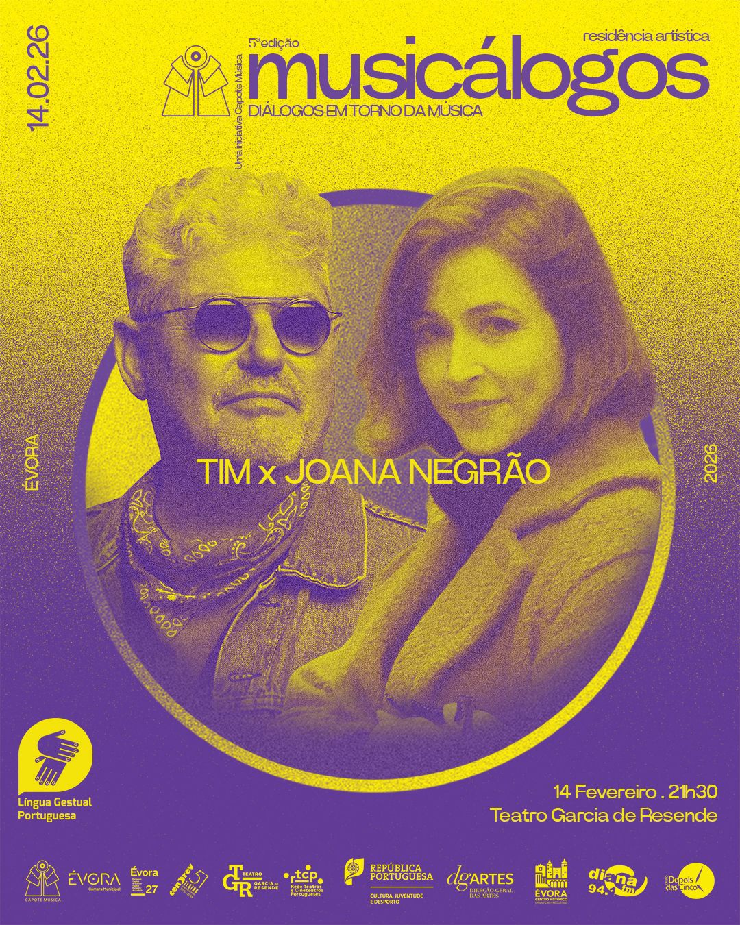 O 2.º encontro do 5º ciclo de Musicálogos vai juntar a cantora, letrista e instrumentista Joana Negrão e o cantor TIM (dos Xutos & Pontapés) num processo criativo colaborativo, de exploração e partilha de ideias e linguagens. No dia 14 de fevereiro, o resultado do processo é partilhado com o público num formato que cruza música e conversa. Esta apresentação decorre no Teatro Garcia de Resende, em Évora, com moderação de Tiago Castro.