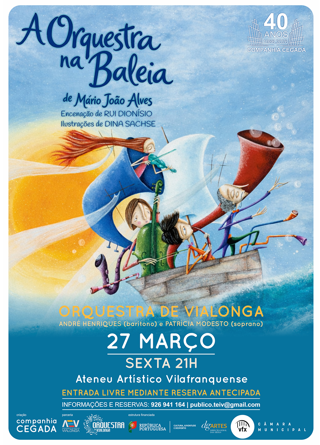 Inspirado no livro “A Orquestra na Baleia”, de Mário João Alves, este espetáculo imersivo convida o público a entrar num universo poético onde música, palavra e imagem navegam juntas. Dentro de uma baleia-orquestra, sons ganham corpo, histórias ganham ondas e a imaginação conduz a viagem. Criado para todas as idades, o espetáculo celebra o encontro, a escuta e o espanto. É também uma festa: a celebração dos 40 anos da companhia Cegada, marcados pela criação artística, pela proximidade com o público e pela permanente vontade de sonhar em conjunto. Uma experiência sensorial que envolve espaço, som e emoção.
