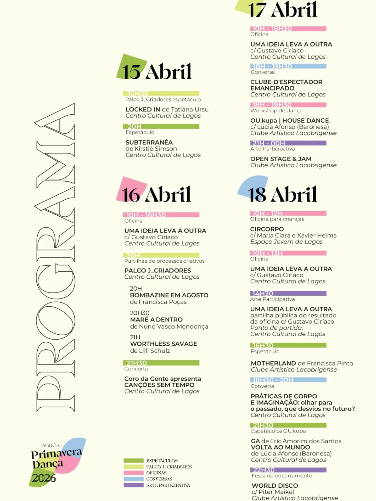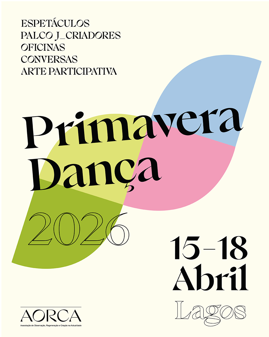 A Associação de Observação, Regeneração e Criação na Atualidade – AORCA promove Primavera Dança 2026, um festival dedicado à dança e aos cruzamentos artísticos, que acontecerá entre 15 a 18 de abril, em vários espaços da cidade de Lagos, incluindo o Centro Cultural de Lagos, o Clube Artístico Lacobrigense e o Espaço Jovem de Lagos.