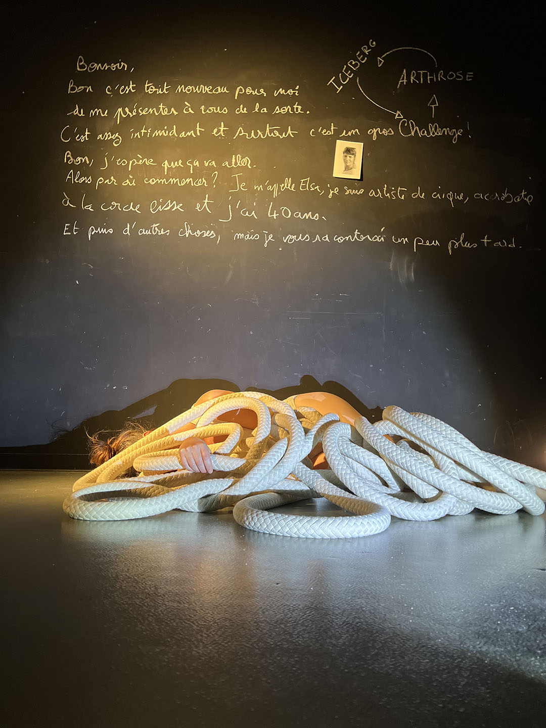 CARNÉ(T) é uma performance de Elsa Caillat, acrobata na corda lisa, cofundadora da Cie Toron Blues, que aqui revisita a sua própria trajetória artística e física aos 40 anos. Numa encruzilhada entre passado e futuro, vigor e erosão, a artista mergulha num relato íntimo sobre o corpo que a acompanha há décadas - corpo aliado, corpo ferido, corpo que protesta, corpo que insiste. Nascido de um processo de escrita, investigação e experimentação artística, CARNÉ(T) questiona a obsolescência do corpo performativo e o lugar da mulher artista no circo contemporâneo. Entre palavra, imobilidade, memória e gesto reduzido ao essencial, a performance expõe as dúvidas, os medos, as fraturas e as persistências que habitam quem vive do próprio corpo.