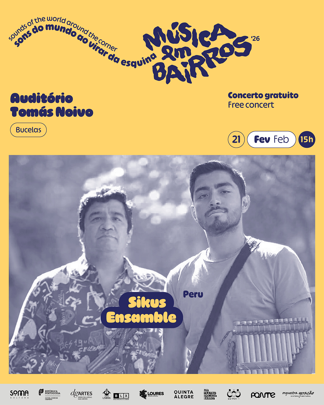 O projeto Música em Bairros, da SOMA Cultura, vai levar a Bucelas (Loures, Lisboa) o duo Sikus Ensamble, que convidará o público para uma viagem musical pelos Andes, no dia 21 de fevereiro, no Auditório Tomás Noivo.