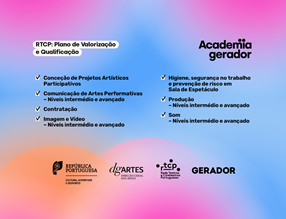 Continuam abertas as candidaturas para a 4ª edição do Plano de Valorização e Qualificação dos Recursos Humanos afetos aos equipamentos da Rede de Teatro e Cineteatros Portugueses [RTCP], uma iniciativa da Direção-Geral das Artes, em parceria com o Gerador. As inscrições podem ser efectuadas para os sete módulos com as aulas a decorrer no norte, centro e sul do país em várias cidades.
