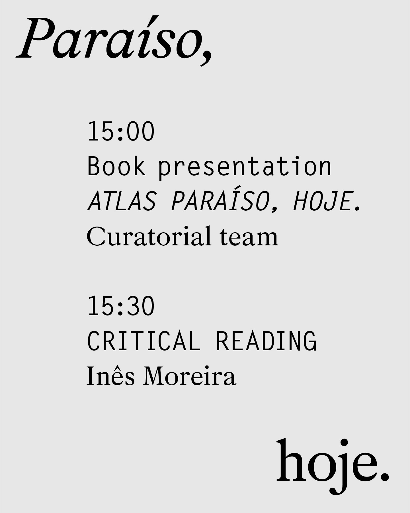 A equipa curatorial do projeto que representou Portugal na 19ª Exposição Internacional de Arquitetura - La Biennale di Venezia vai apresentar, no dia 22 de novembro, o Livro "Atlas Paraíso, hoje." em Veneza, ao que se seguirá uma leitura crítica feita pela arquiteta e investigadora Inês Moreira. Mais tarde terá lugar um debate em torno dos temas de Paraíso, hoje. e da paisagem, que junta o arquiteto paisagista João Nunes, o professor Luigi Latini, e a curadora-adjunta deste projeto, a arquiteta paisagista Catarina Raposo, com moderação do professor Luca Zilio.