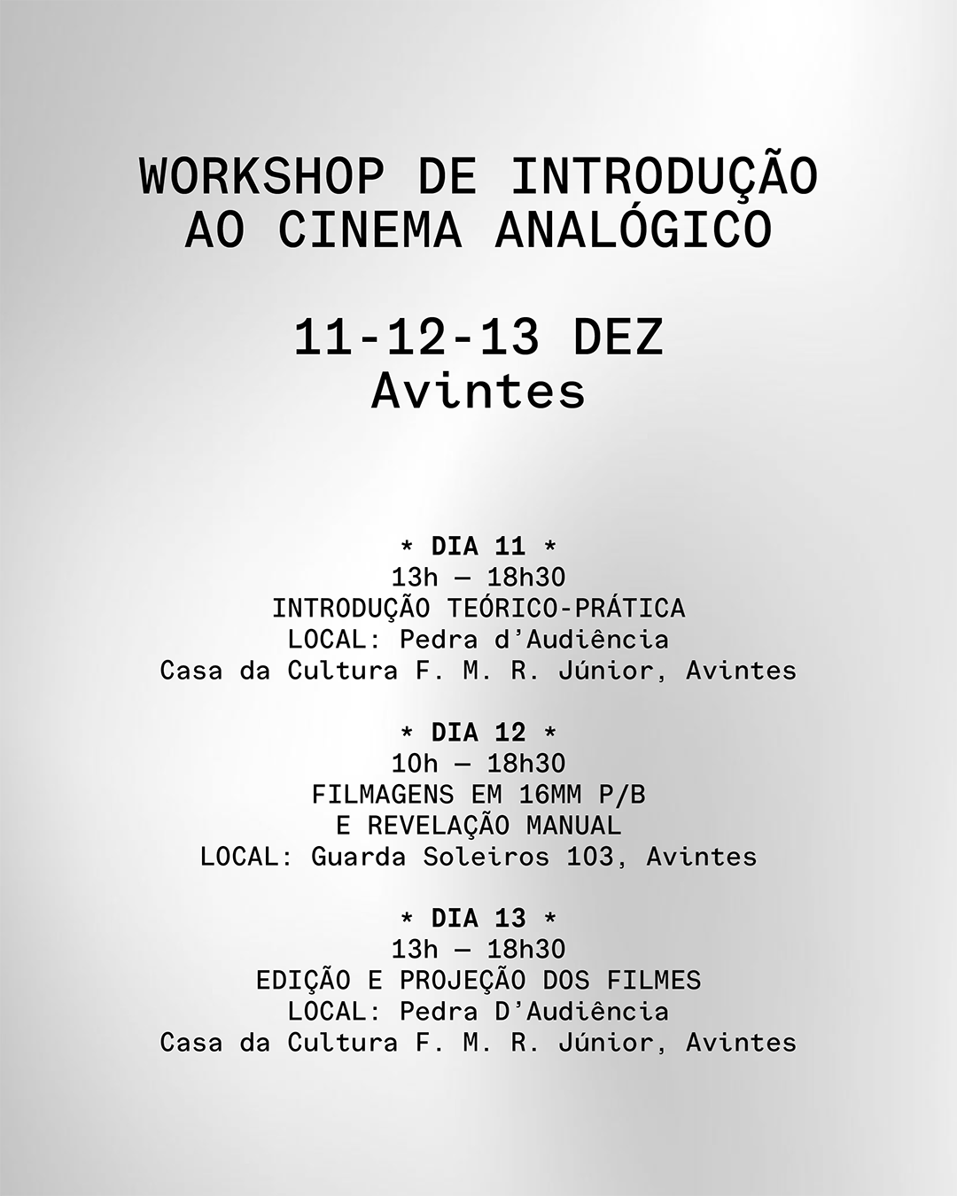 Entre 11 e 13 de dezembro, o projeto GUARDA SOLEIROS vai promover, em Avintes, um workshop de introdução ao cinema analógico. A iniciativa é organizada em parceria com o cineclube Pedra D'Audiência, sediado na Casa da Cultura Francisco F. M. R. Júnior.