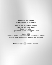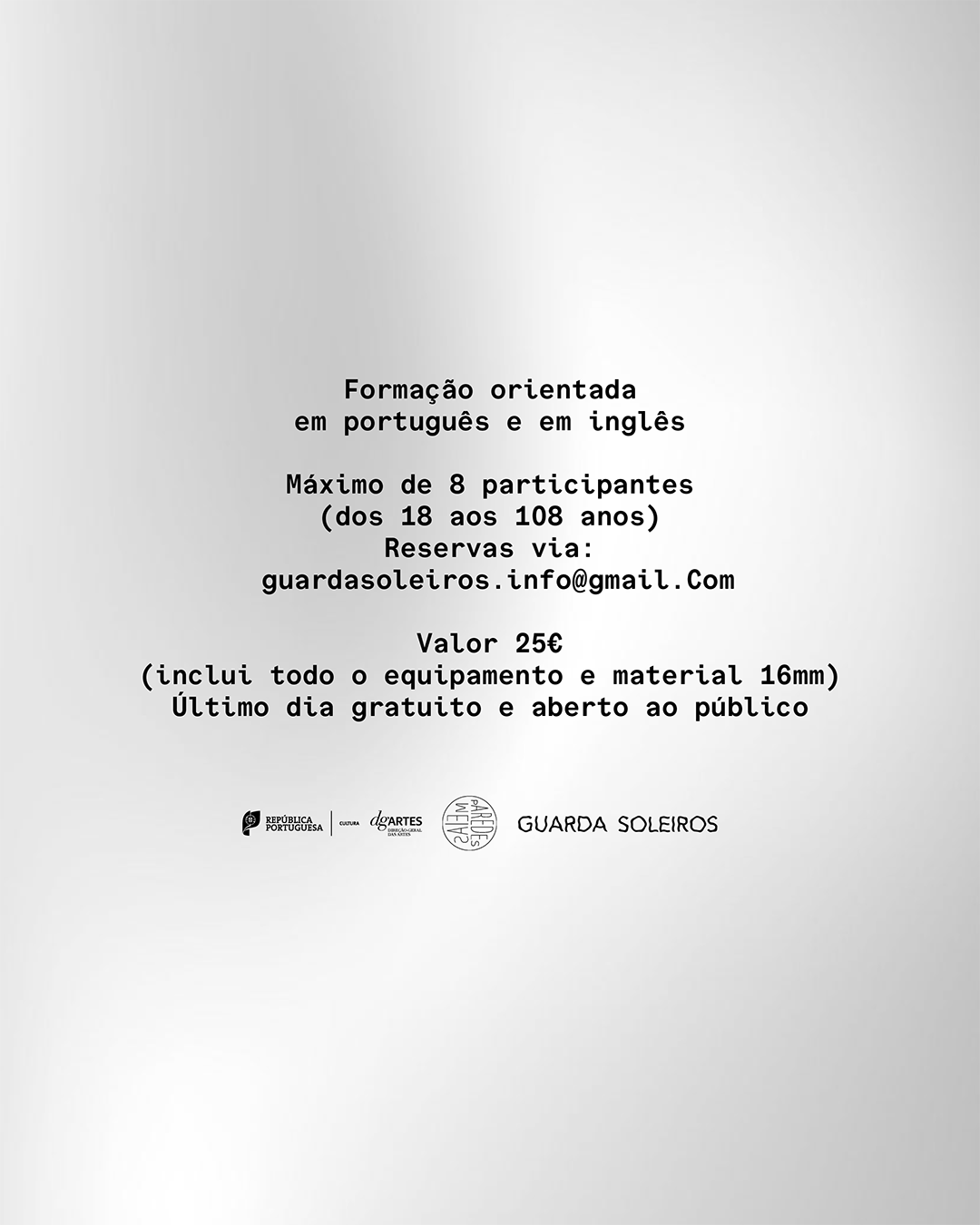 Ao longo dos 3 dias serão transmitidos aos participantes "os conhecimentos basilares de produção cinematográfica analógica, num contexto experimental, utilizando processos manuais e película preto e branco negativo. Desde o manuseamento de uma câmara, à captação de imagem, seguido de procedimentos de revelação manual e projeção de filmes". As inscrições deverão ser efetuadas através de guardasoleiros.info@gmail.com.