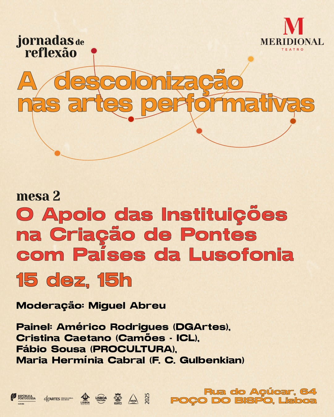 Nos dias 15 e 16 de dezembro, o Teatro Meridional promove as Jornadas de Reflexão sobre o Impacto da Descolonização nas Artes Performativas. O evento reúne artistas, investigadores, companhias, instituições "e todos os que vivem a cultura de perto para refletir sobre como o legado colonial continua a atravessar a criação contemporânea e de que forma podemos construir futuros mais plurais". A iniciativa assinala os 50 anos das independências de Angola, Cabo Verde, Moçambique, São Tomé e Príncipe e Guiné-Bissau, abrindo um diálogo horizontal sobre memória, política, circulação, criação e cooperação cultural.