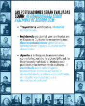As candidaturas serão avaliadas de acordo com o seu historial comprovado, a sua representatividade setorial e/ou territorial no ECI, o trabalho em rede e o contributo para abordagens transversais como a inclusão, a acessibilidade, o trabalho com públicos e a democracia cultural. A representação terá a duração de dois anos e implicará a participação (por enquanto em formato virtual) em até quatro sessões anuais.
