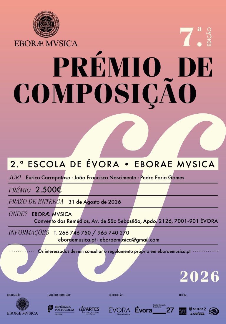 A Eborae Mvsica - Associação Musical de Évora promove a 7.ª edição do Prémio de Composição "2ª Escola de Évora| Eborae Mvsica". As obras podem ser entregues até 31 de agosto de 2026.