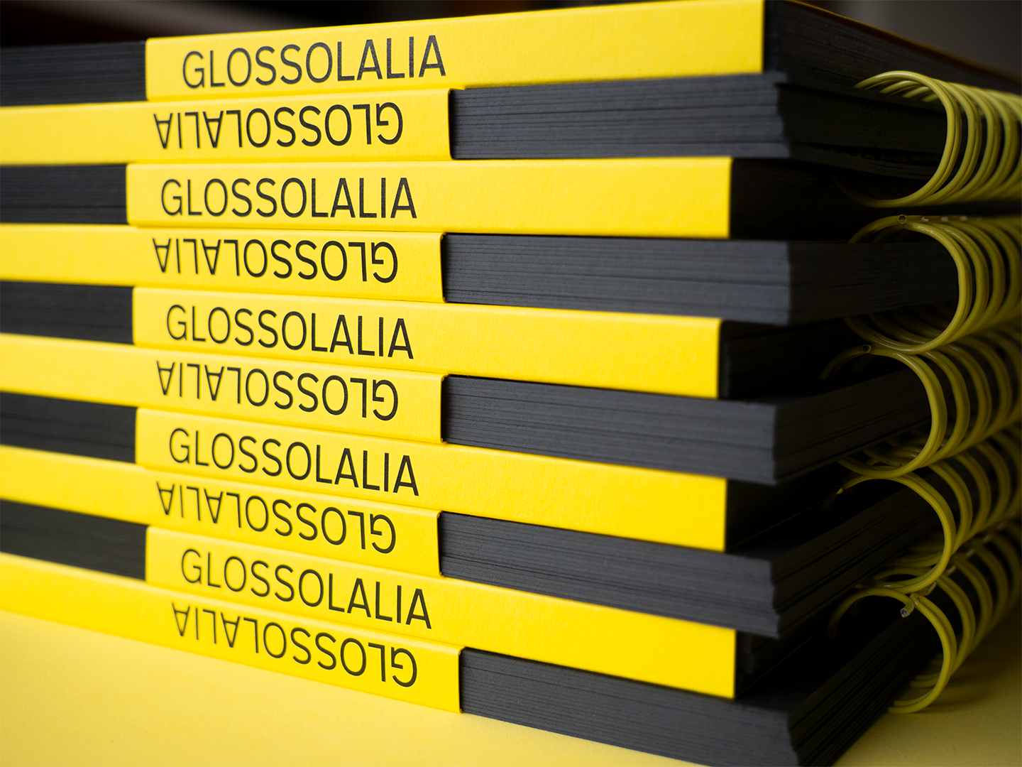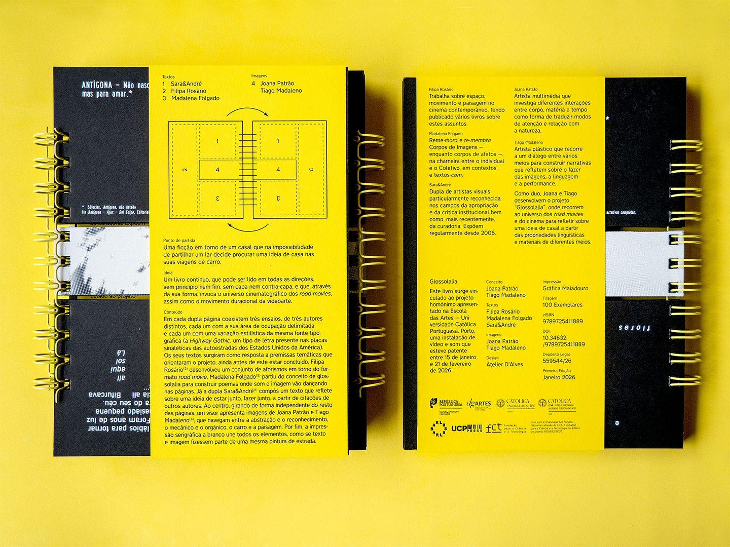 “Glossolalia” é um projeto de criação artística que tem como mote uma ficção em torno de um casal que persegue uma ideia de casa nas suas derivas de carro. Explora-se o conceito de um livro contínuo, que pode ser lido em todas as direções, sem princípio nem fim, sem capa nem contracapa e que, através da sua forma, invoca o universo cinematográfico dos road movies, assim como o movimento duracional da videoarte. Pensado como um espaço de simultaneidade e convergência de vozes, o livro, com design do Atelier d’alves, conta com aforismos de Filipa Rosário, poemas visuais de Madalena Folgado e um conjunto de citações selecionadas pela dupla Sara&André, que estabelecem um diálogo com imagens da autoria de Joana Patrão e Tiago Madaleno.