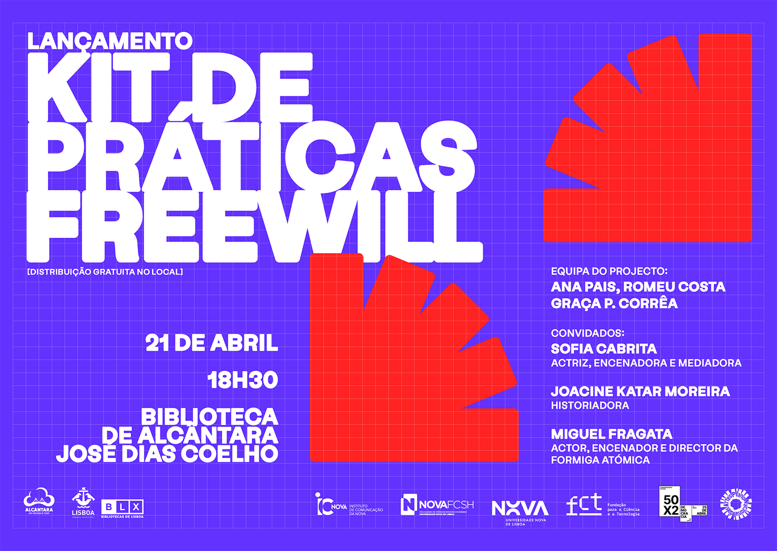 O ebook "FREEWILL — Afectos da Liberdade — kit de práticas e outras coisas úteis" é apresentado no dia 21 de abril, às 18h30, na Biblioteca de Alcântara (Lisboa), numa sessão que contará com as participações de Ana Pais, Romeu Costa, Graça P. Corrêa, Joacine Katar Moreira, Sofia Cabrita e Miguel Fragata. A publicação constitui um dos resultados do projeto FREEWILL - "livre arbítrio e o desejo de liberdade - os afectos na performance da democracia", coordenado por Ana Pais e realizado no âmbito do programa "o 25 de Abril e a democracia portuguesa", financiado pela FCT/Comissão Comemorativa 50 anos do 25 de Abril.
