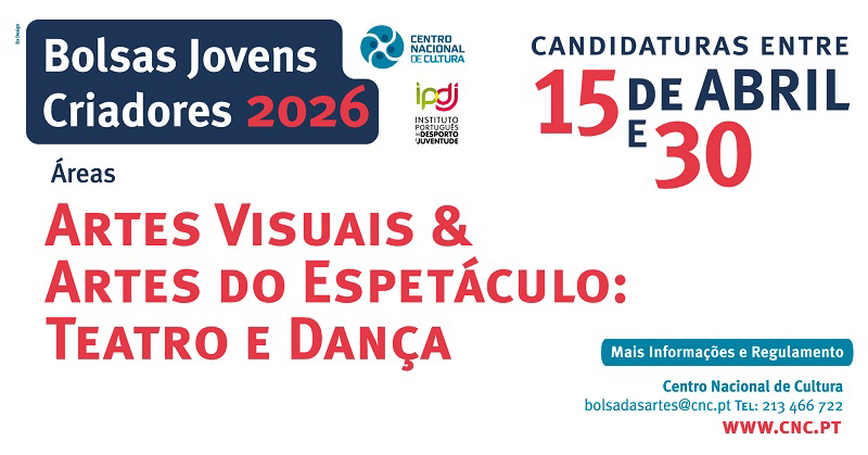 Decorre até 30 de abril o prazo de apresentação de candidaturas ao programa Bolsas Jovens Criadores 2026, nas áreas de Artes Visuais (Artes Plásticas, Fotografia e Vídeo) e Artes do Espetáculo (Teatro e Dança).