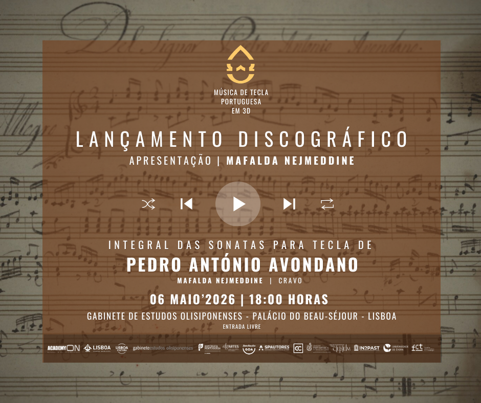 A AcademyOn lança o projeto "MÚSICA DE TECLA PORTUGUESA EM 3D", com a cravista e musicóloga Mafalda Nejmeddine (coordenação científica e artistica) e Fouad Nejmeddine (direção e produção). A apresentação decorre no dia 6 de maio, às 18h, no Gabinete de Estudos Olisiponenses, Palácio Beau-Séjour, Lisboa.
